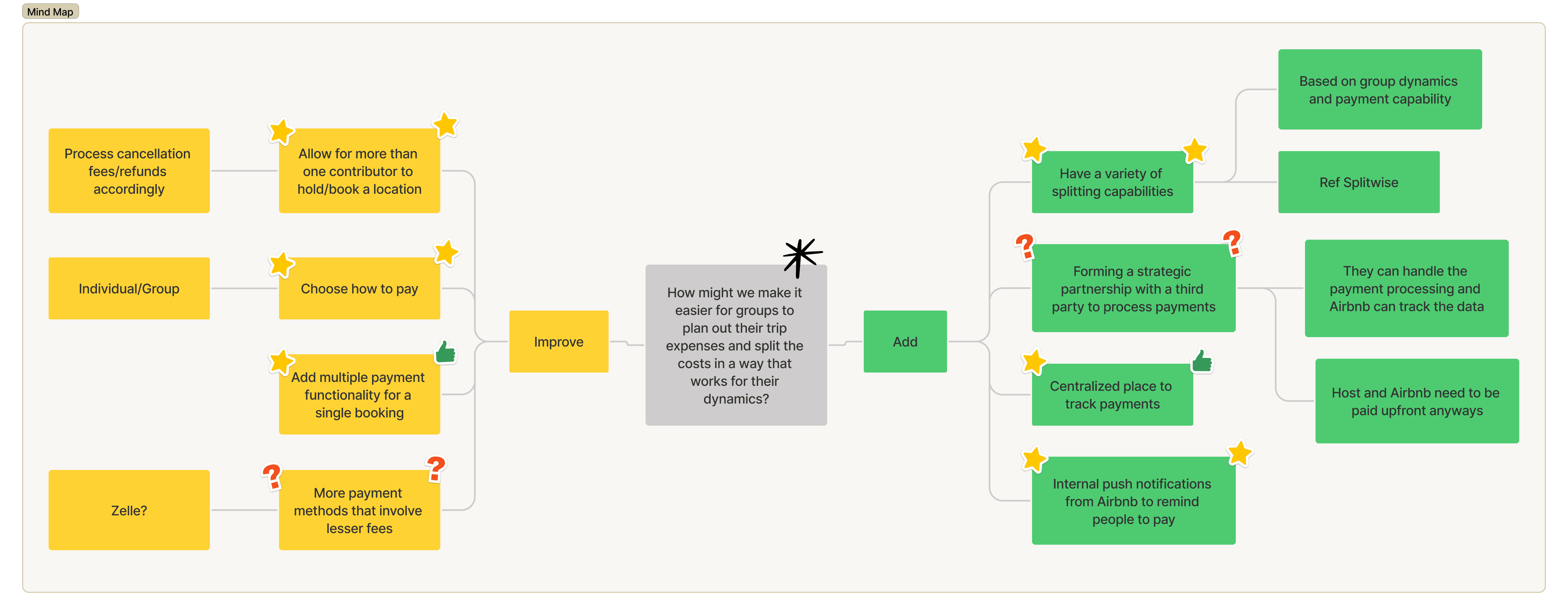 We used mind maps to ideate on possible way to add to or improve upon Airbnb’s existing booking flow to answer two questions: