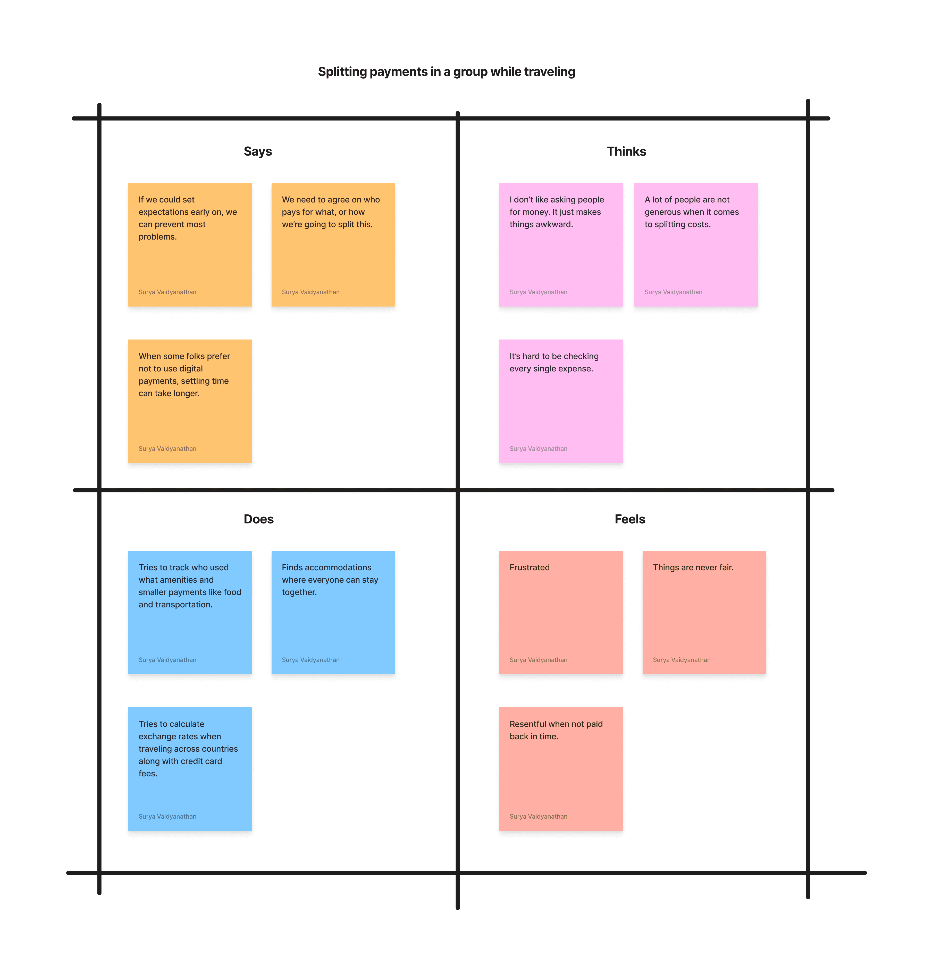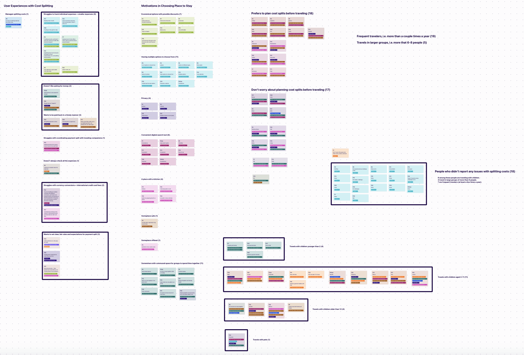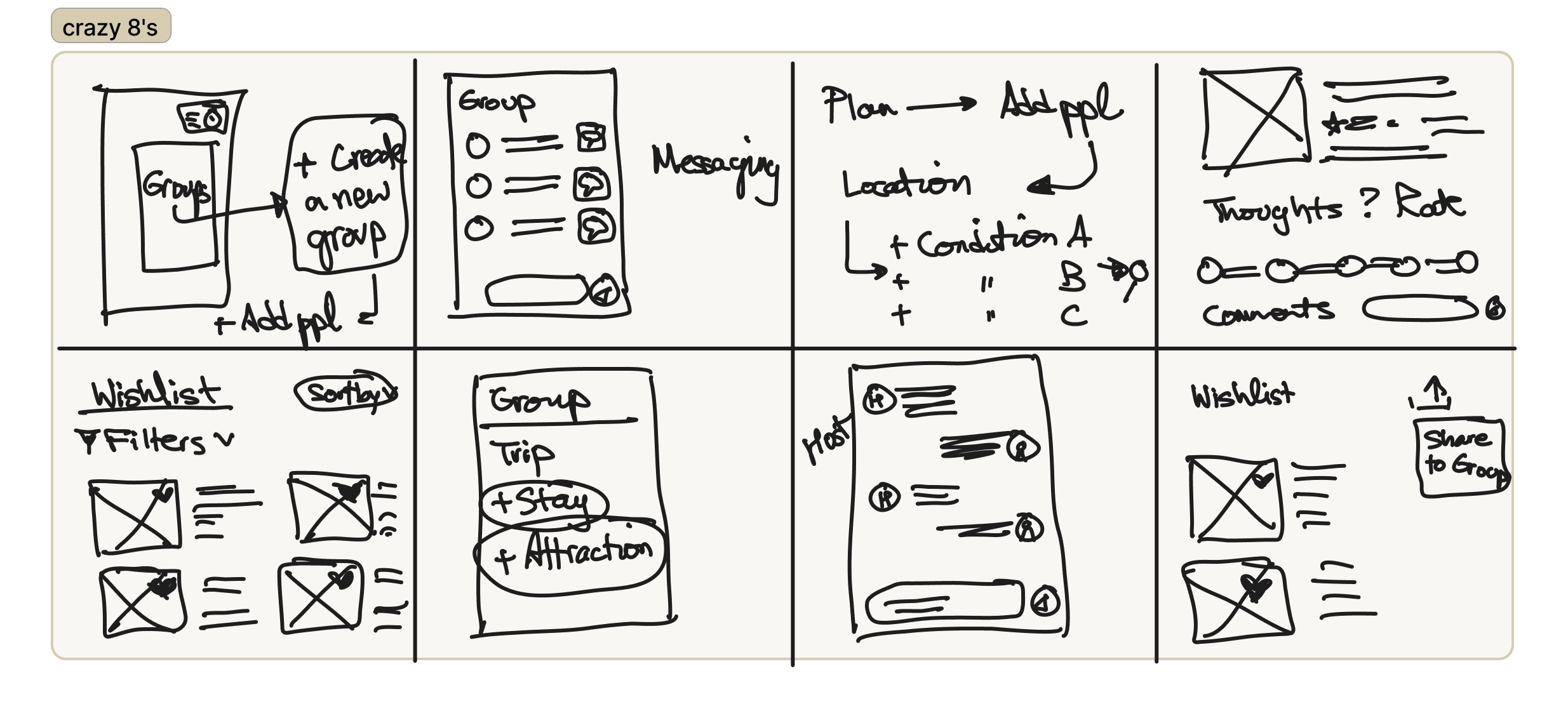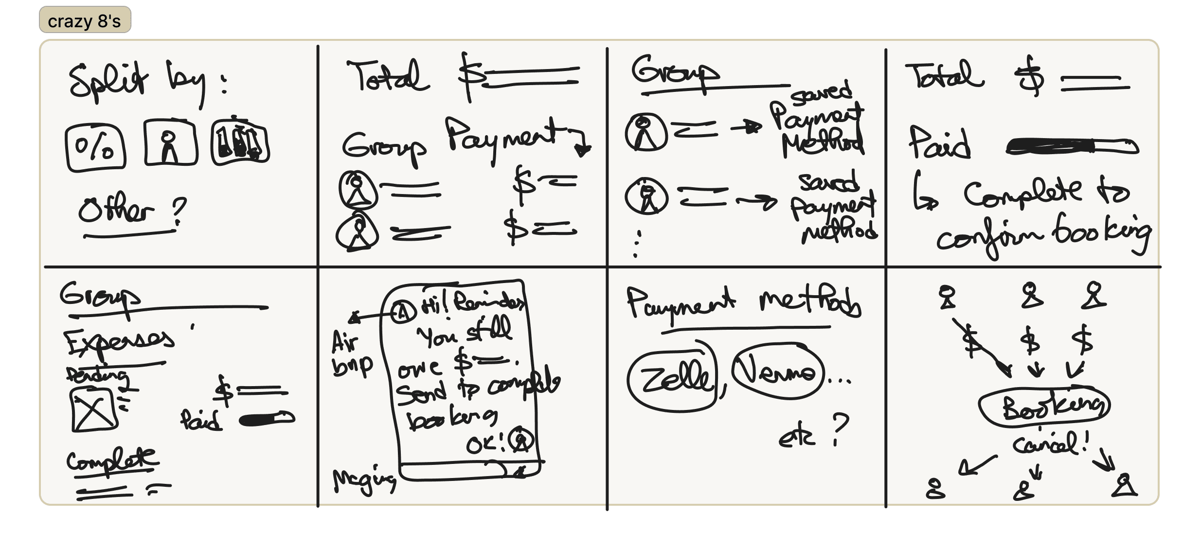 We mapped out user journeys to simplify trip planning and payment management. Using mind maps and Crazy 8s, we prioritized split payments as the MVP feature, balancing impact and development speed.