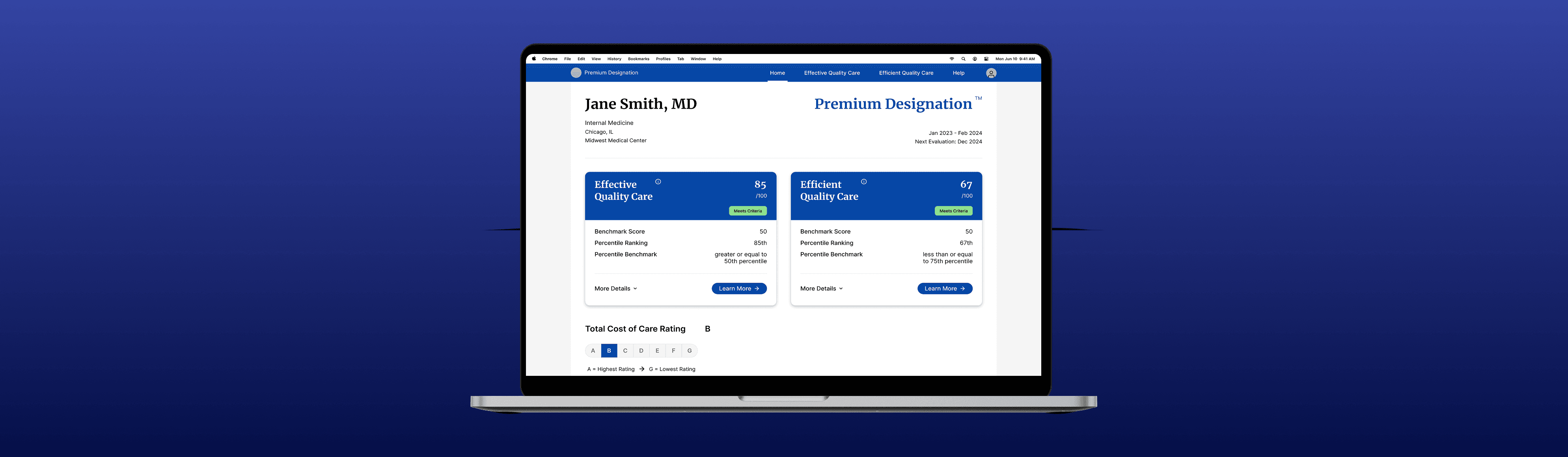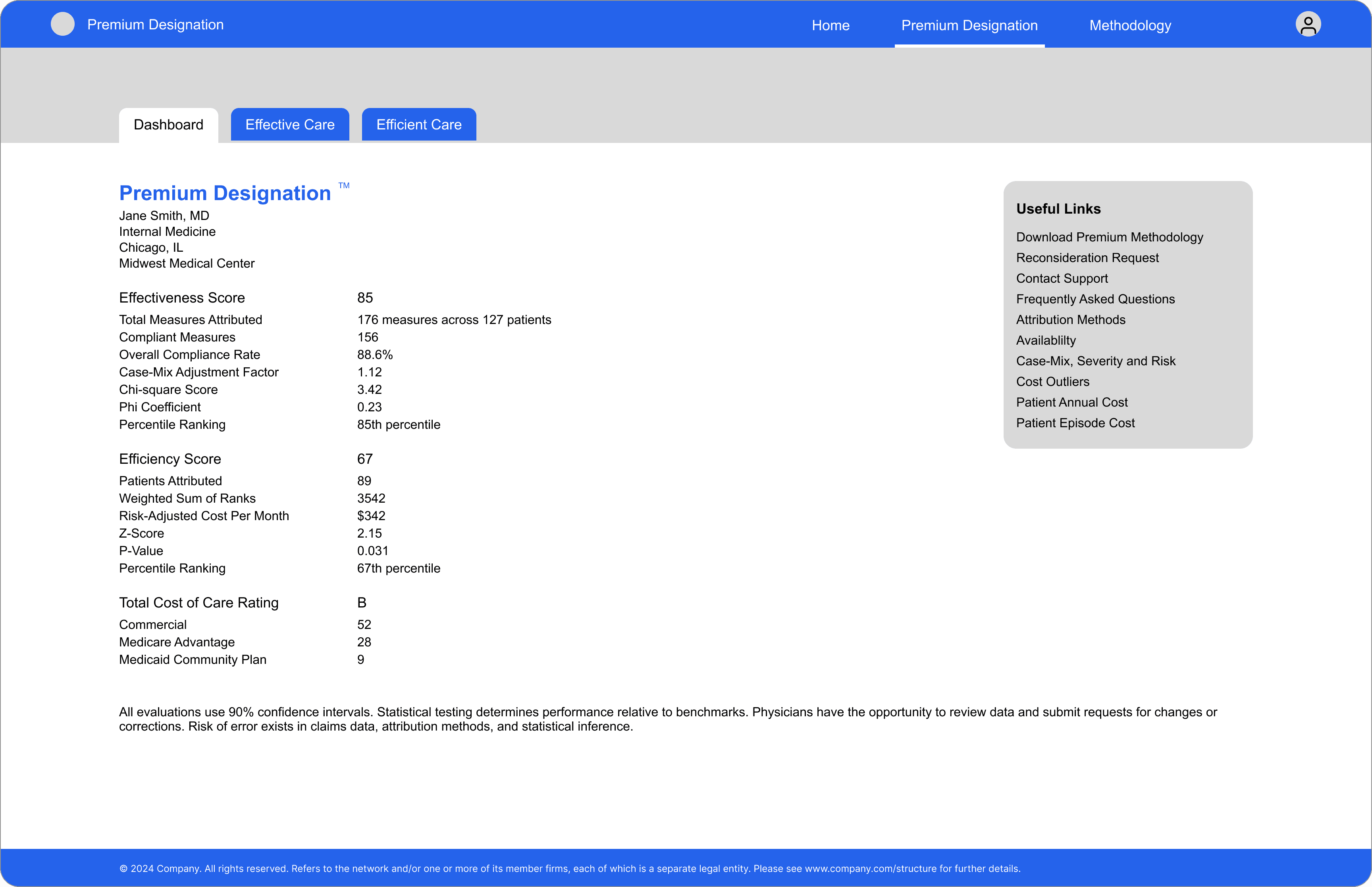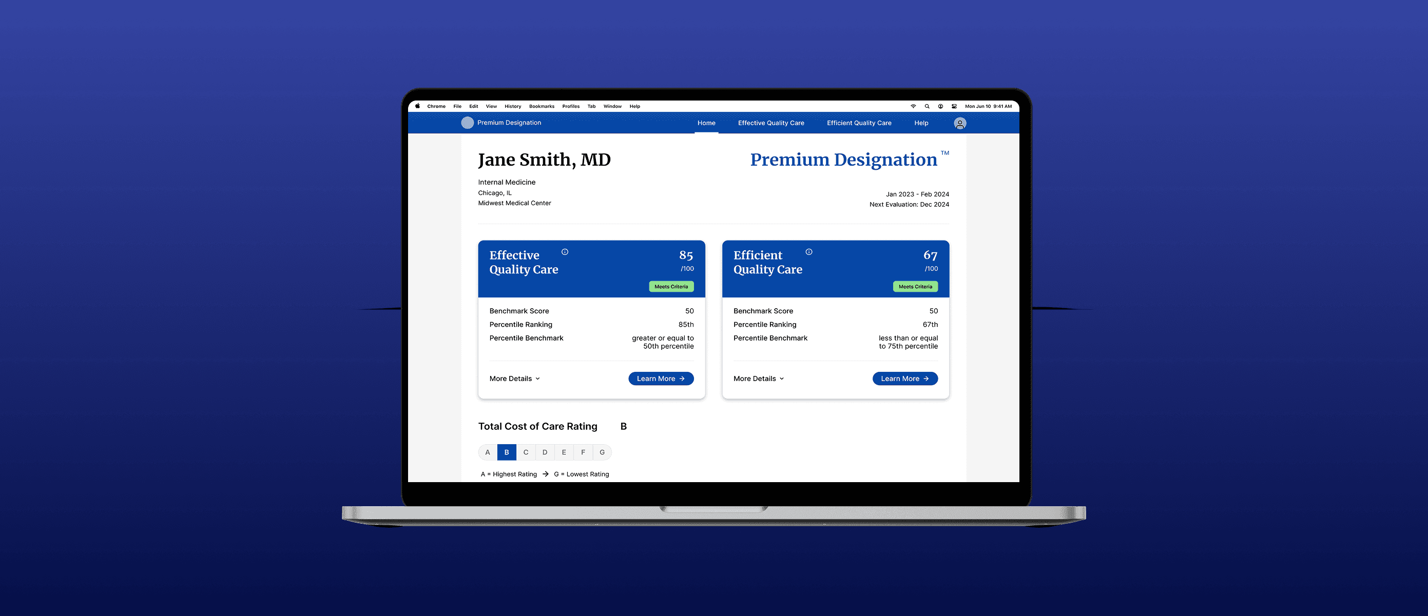 The platform evaluates physicians on two core metrics: one measuring clinical quality (do you follow evidence-based guidelines?) and one measuring cost efficiency (how do your costs compare to peers?). Based on these scores, physicians either receive a designation or they don't. This designation affects their visibility to patients and referral patterns.