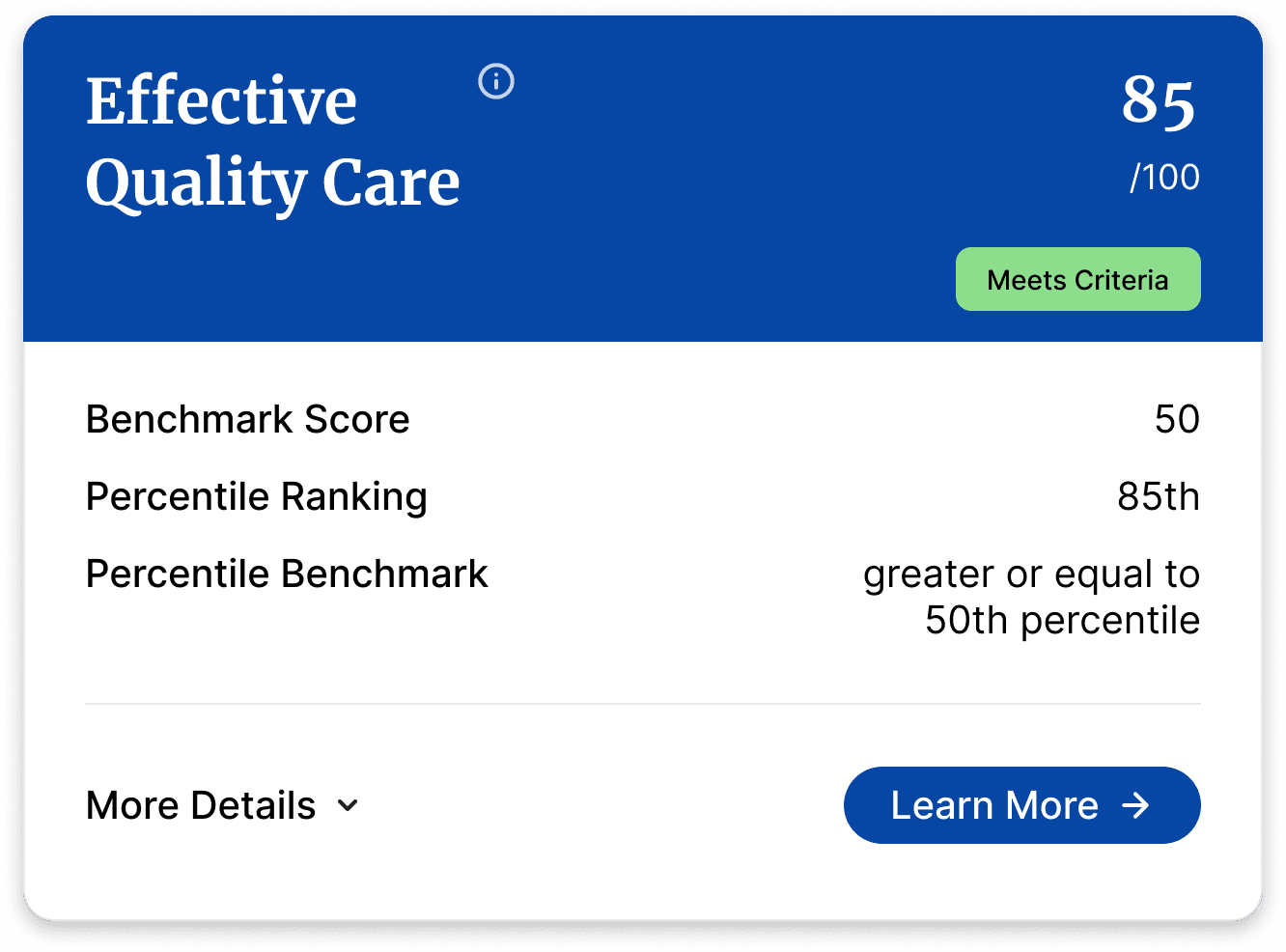This is a more detailed breakdown for physicians who want to understand their scores better. It is detailed by category with comparison to benchmarks and what's affecting their score. Explanatory text at the top clarifies what the score measures in plain language.
