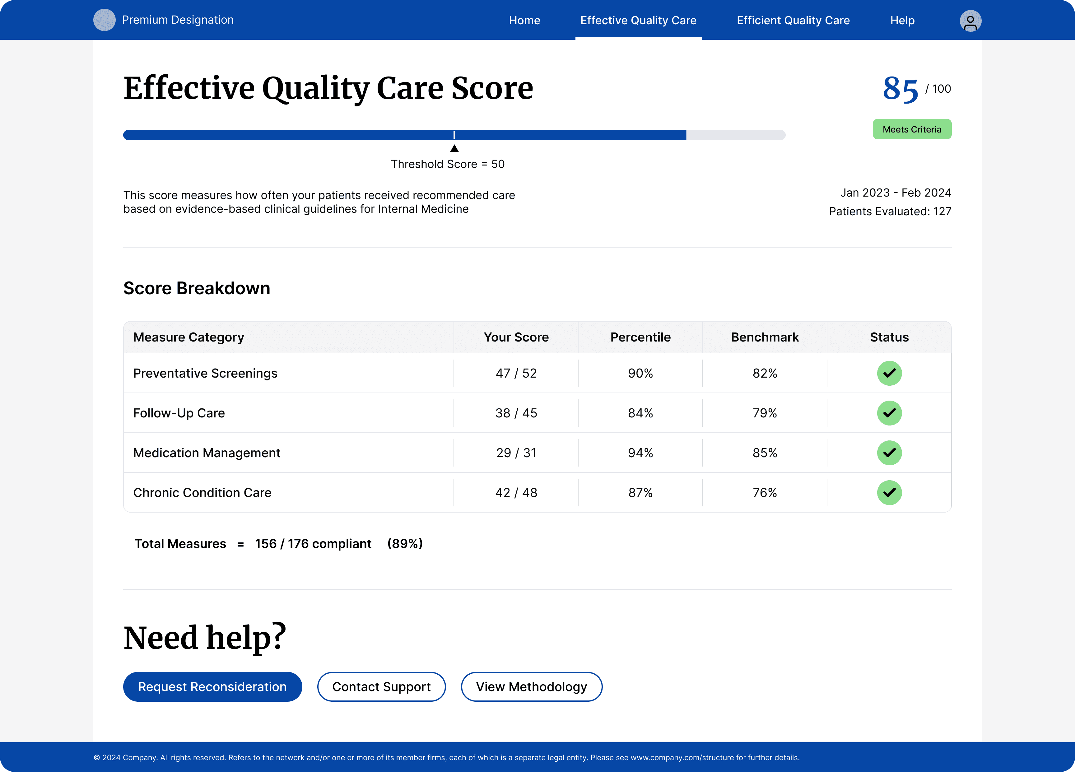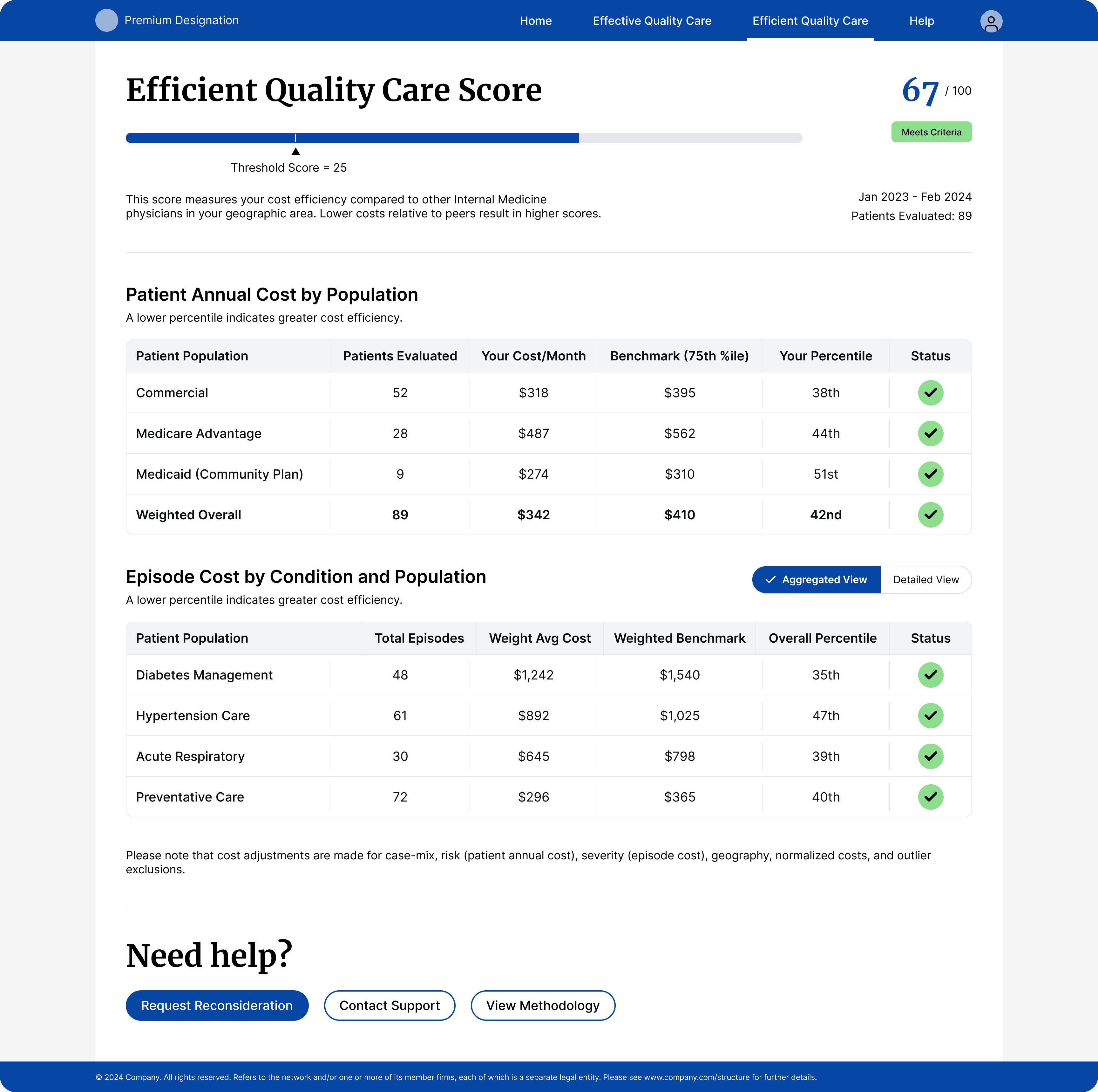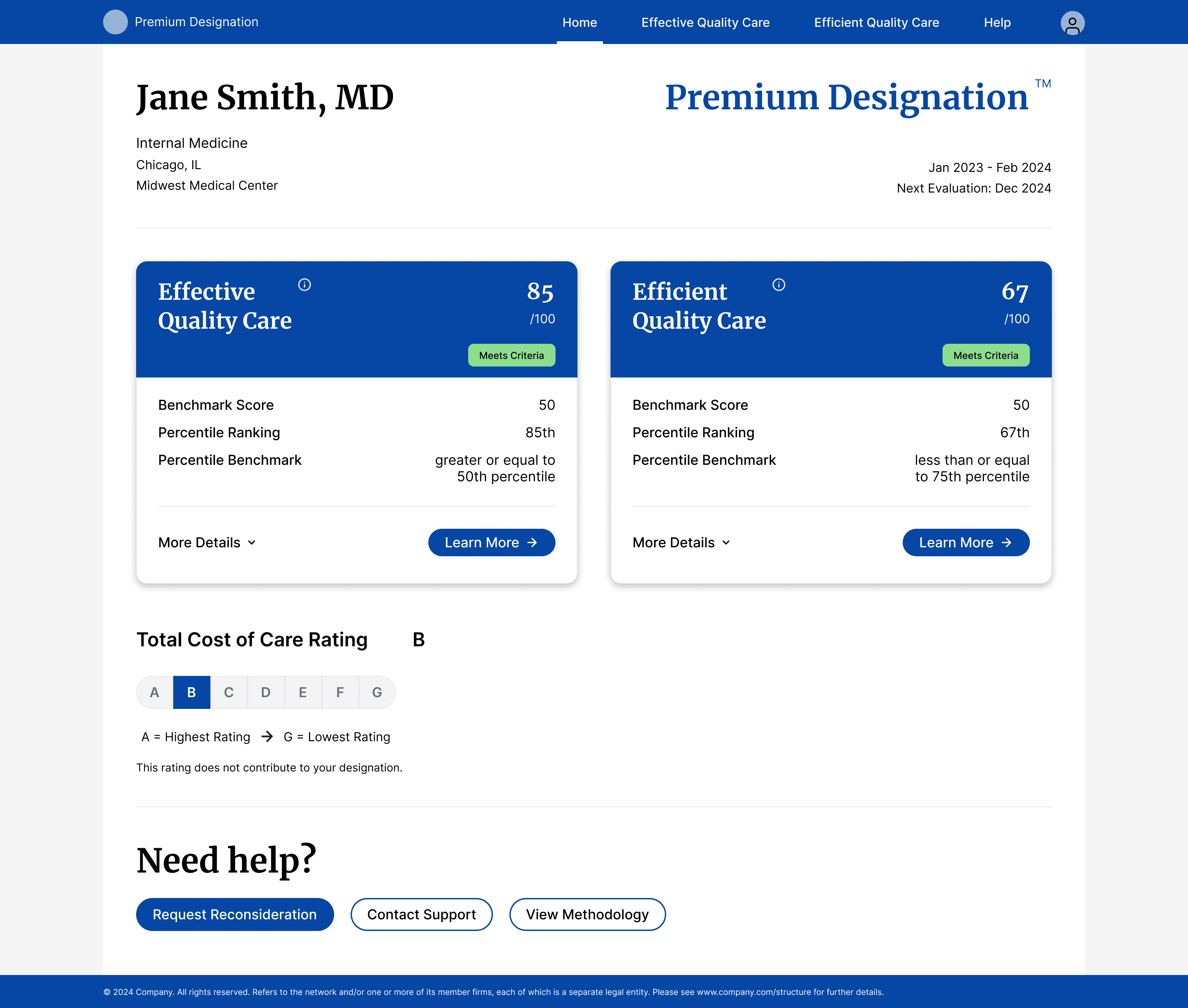 This is the first thing physicians see. Designation status is the hero element: did they qualify or not? Below that, their two scores with visible thresholds and tooltips explaining what each measures. Clear actions: View Details, Request Reconsideration, Contact Support, View Methodology.