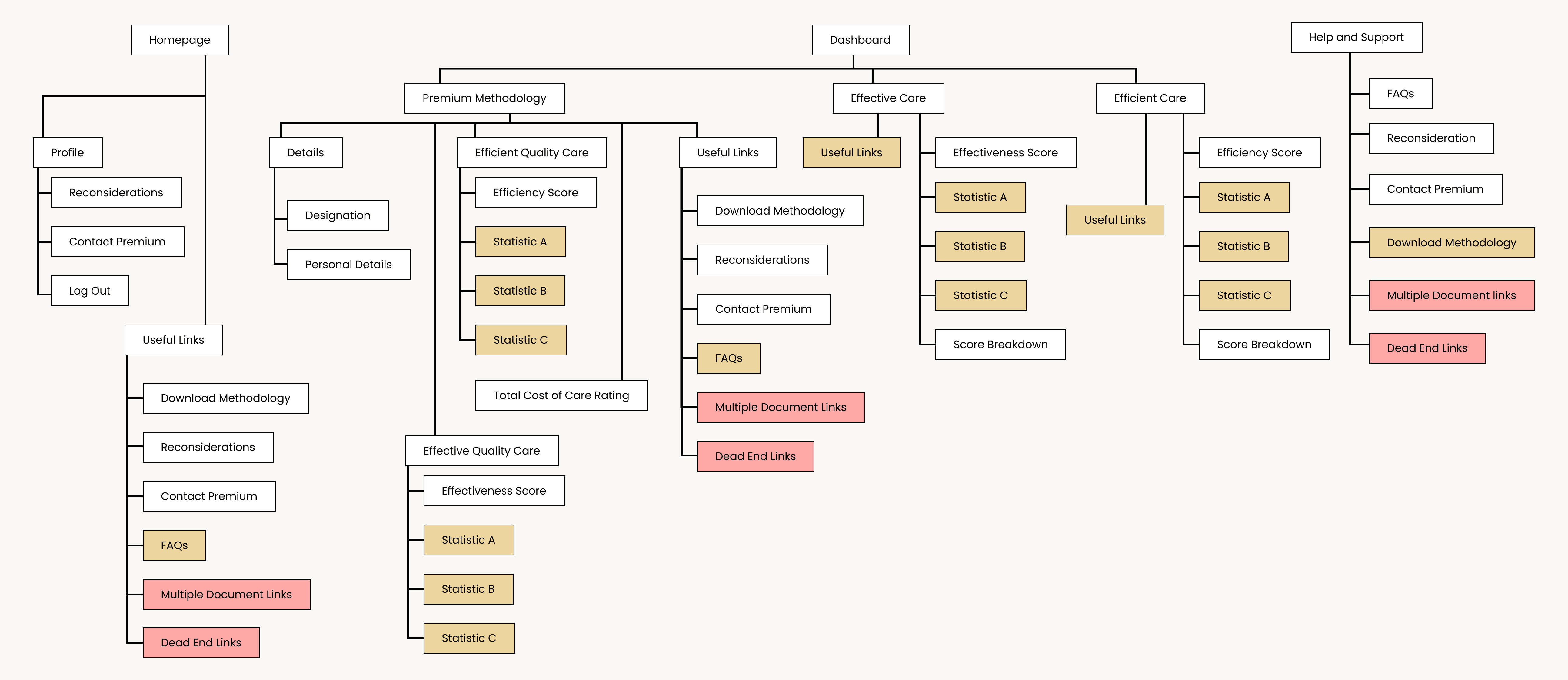 Beyond the data overload, the site architecture itself created confusion. A heuristic analysis revealed multiple entry points leading to the same content, navigation dead ends, and critical information nested two or three levels deep. There was no clear hierarchy guiding users to what mattered most.
